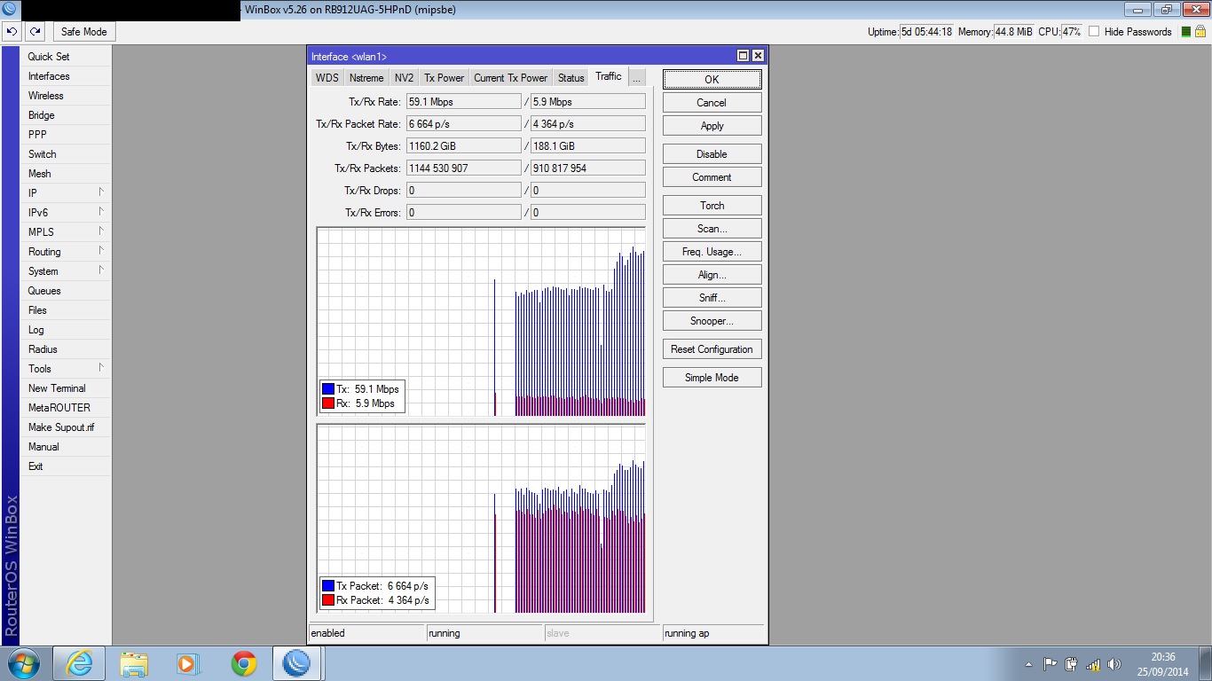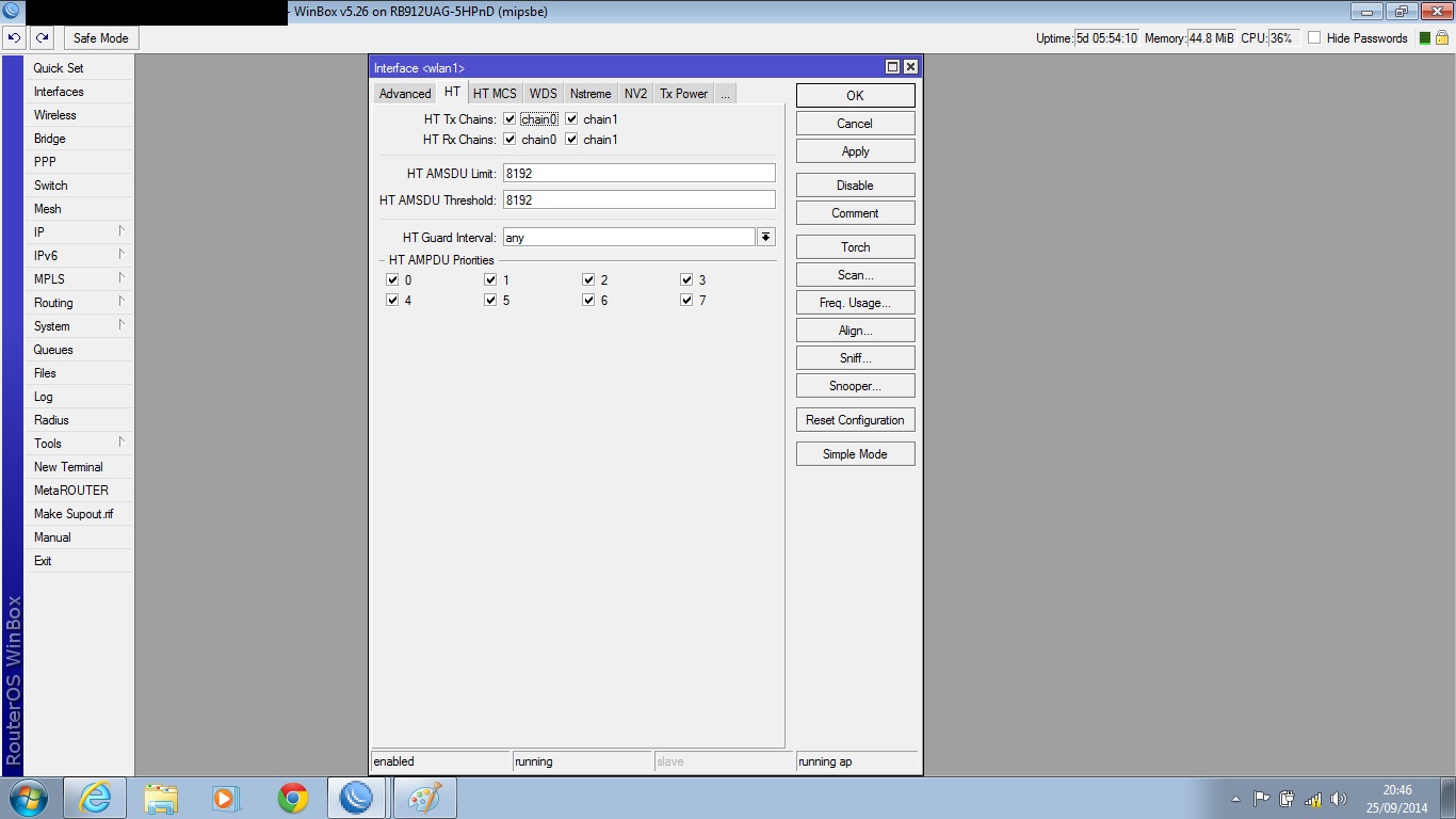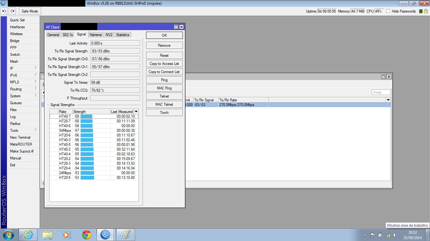 Realizo teste tcp tranquilo, mas basta por pra rodar teste de UDP Both o ccq de um das chain cai pra 60% e mcs dela vai junto e nao volta mais até reiniciar a rb. Quando isso acontece a banda vai la pros seus 30mb