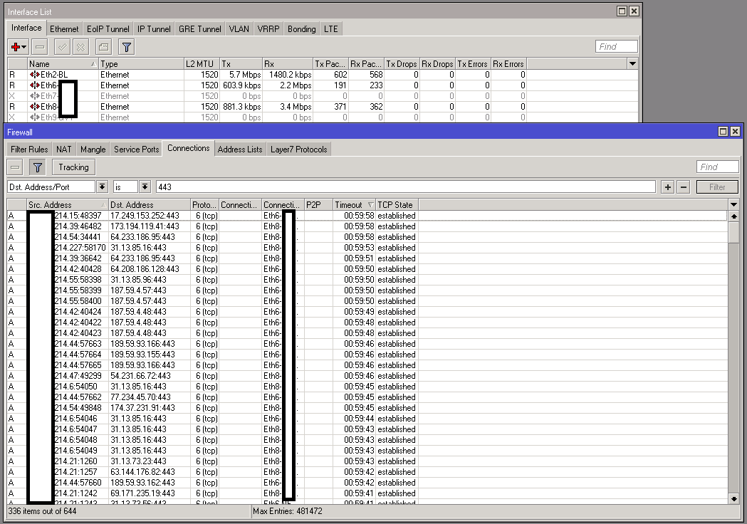 Note que as conexões HTTPs estão saindo por ambos os links (Eth6 e Eth8).