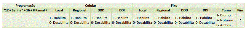 *12+1234*16#210#000000001* (Bloqueio diurno, 1234 senha padrão do pabx);