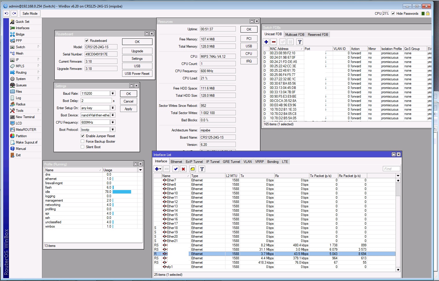 Veja minha print 21% de Processamento, 20Mb de ram em Uso, 43.5 Mbs Passando e 165 Conexões ativas, O que vou querer mais de Um Sw de 600 reais ? Ainda passo pelo cpd e fico só admirando o seu gráfico subindo e descendo kkk, Pode ate ser que pra seu objetivo ela seja realmente fraca, mais acho que poucos vão ficar né uma rede outdoor transferindo arquivos a 1Gps, pra isso uso um sw só pra rede interna (Intelbras).