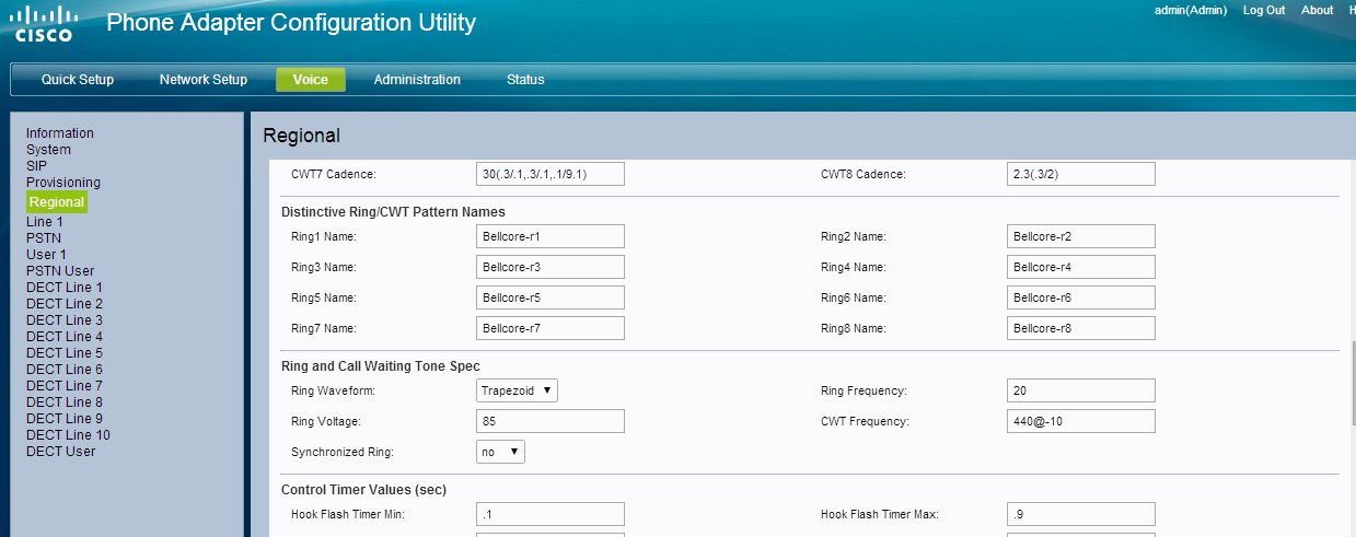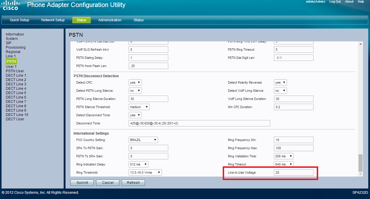no print, onde está escrito Line-in-Use Voltage eu alterei para 20 e funcionou, ele reconheceu a linha, porém ficou chiando demais, com muito ruido quando tiro o telefone do gancho. Após discar para algum ramal, quando chama ele para de chiar e a ligação fica normal.