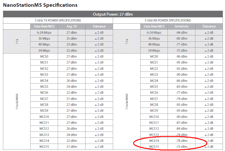 Segundo o datasheet do NS M5, MCS14 e 15 tem sensibilidade de -78 e -75 respectivamente: