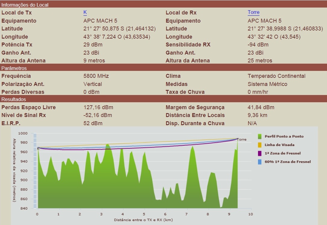Pretendo obter um link de 8,5KM para levar internet 10MB para um cliente de sua casa na cidade para seu sitio, no AirLink a situação acima comtemplei interferencia de 10db, apesar da área a ser enviada o sinal conta com mínimas redes wifi, apenas com arvores, matas e eucaliptos, a torre na estação 1 tem 7 metros e a torre na estação 2 terá 8 metros, o que observo é que basta eu diminuir a torre de um dos lados para menos de 7 metros o link aparece como interrompido, e com relação ao apontamento pretendo utilizar o gps, já possuo as coordenadas que são: Coordenada A: -21.474214, -43.558361, Coordenada B: -21.463925,-43.638572, já as marquei no GPS daí pretendo apontar com o uso deste, tem algum programa mais apropriado? E este link será que vai funcionar perfeito, terei dificuldades para encontrar as redes com uso do GPS?