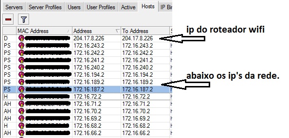 Ola, maus caros colegas de rede estou com um problema que nao sei como resolver ja tenho 3meses sem dormi e comer direito de cabeca quente, vamos la vou tentar explicar o que esta acontecendo tenho uma pequena rede cabeada ha 3 meses a traz eu usava os roteadores em bridge mais resolvi mudar pois o cliente tem sempre um tablet celulares etc e nao da para ficar toda hora add login e senha entao resolvi mudar e colocar a configuracao do roteador dinamico pronto !! o cliente acessa o que ele quiser com qualquer aparelho no wifi porem o que comecou a acontecer e que os roteadores estao enviando ip na tela do hosts do mikrotik, os clientes no cabo esta acessando normal mais no wifi tem dificuldade para acessar ate msm a pagina de login que deveria aparecer automatico, dai peco ao cliente desligue e ligue e volta a funciona porem continua mostrando ip no hosts do servidor, ja mudei a faixa de ip dos roteadores e continua mostrando e nao so um sao varios esse e so um veja a image, quem pode e souber por favor me ajuda.. desde ja muito obrigado.