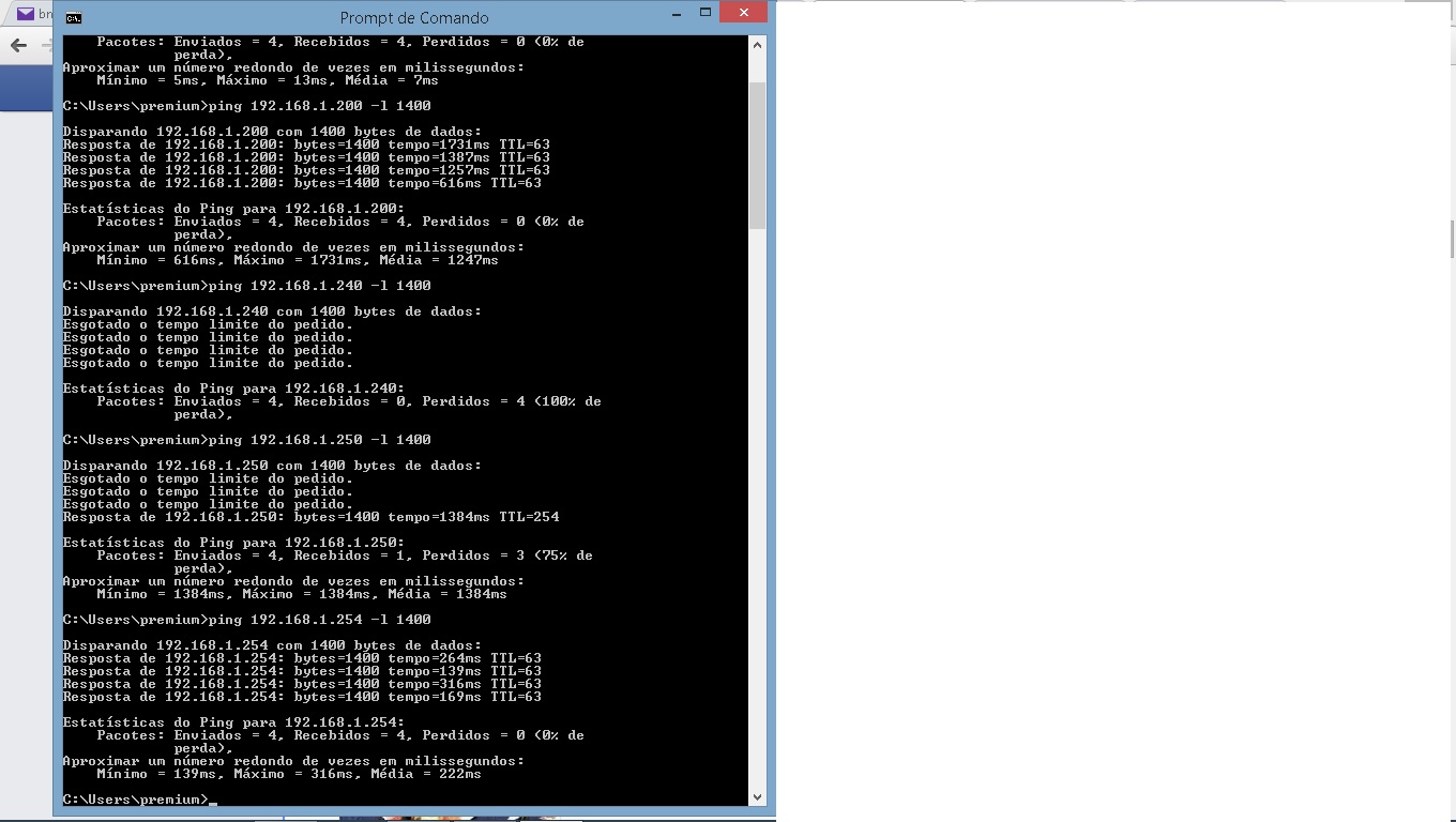 Ah, lembra de dar ping -t 192.168.x.x -l 1400 paralelo ao "ping normal", o -l de Large indica o tamanho do ping em bytes, o default é 64B, informando -l 1400 você dá ping com pacote do tamanho dos pacotes que são usados pra navegação e downloads, ou seja, é uma verificação mais "mundo real" do que dar ping a 32 ou 64B apenas.