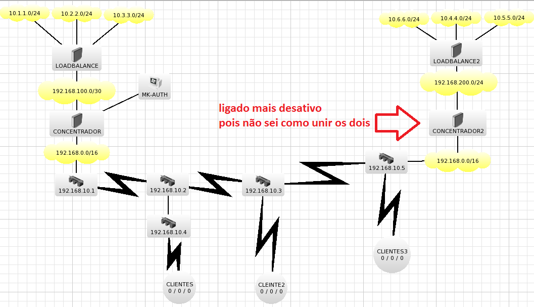 olá galera, to com um probleminha aqui meus links aqui muito ruim da OI ai fiz o seguinte Fiz 2 balance e 2 concentradores 1 mk-auth tudo Interligado por ptp eu tenho tbm um mk-auth que esta se comunicando com os dois concentradores perfeitamente por vpn, quando eu ligo os dois servidores pppoe na rede só o que já esta ativo funciona o novo não, se eu desligar o novo e ligar o cabo direto no meu computador funciona certinho o que deve fazer pra resolver isso vou colocar meu cenário.