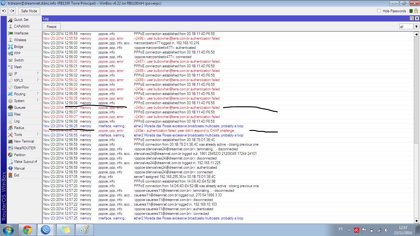 Primeiro passo, tira a necessidade de password no pppoe, crie um usuário com esses dados que ta dando "erro", aguarde o gaturno logar, apos isso você vai ter que descobrir de onde ele vem...