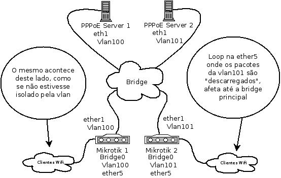 A alguns meses tenho planejado uma mudança em um provedor que atendo, ele usa uma grande bridge e estamos querendo "segmentar" esta grande redes em redes pequenas, usando Vlan, a idéia é manter centralizados os concentradores PPPoE e fazer chegar todas as bordas internas até eles com Vlan, ai que entra o problema, em laboratório criei o cenário que está em anexo, e para minha surpresa, e que surpresa, fechado um loop do lado da borda ontem não tem contato "físico" com a rede do "meio" o loop se espalha rapidamente por toda a rede do provedor, verifiquei varias vezes a bridge no lado no mikrotik que atende o PoP (ether5), e dentro da bridge esta apenas a interface vlan e a ether5, sendo que eu fecho (tagged vlan) na porta ether1, alguém já passou por isso?Anexo 56181