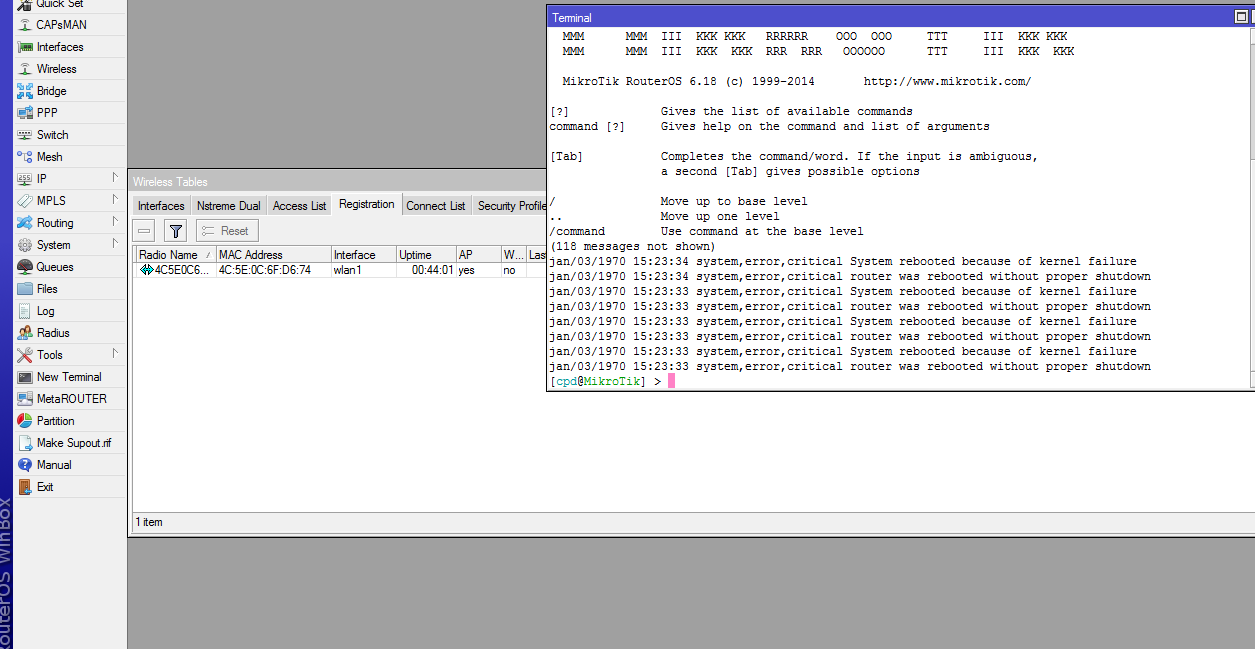 Olá amigos,estou com ptp com netbox5 funcionando porem em uma das pontas esta dando erro.Do nada reinicia e volta ao normal.Conexões ok,configurado como bridge e station bridge,cabo blindado e aterrado,fonte original.Segue print erro.