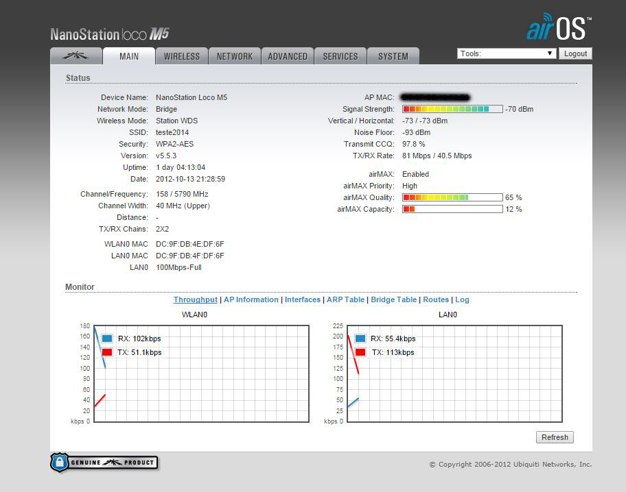 (Mas com sinal tão baixo (Pro datarate de 81M) ativar ou desativar airmax não faz efeito. Veja sempre no datasheet a sensibilidade, e aplique algo tipo 15 a 20dBm de SNR mínimo requerido (Se for pra datarates acima de 100M pense em 30dBm de SNR), assim fica fácil entender pra que datarates um determinado nível de sinal serve)