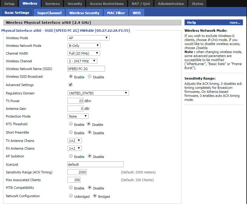 Vamos la, nos sabemos que 802.11 foi criado para ambientes indoor e para conexoes NLOS ou LOS o que conseguimos aqui foi conectar clientes SEM VISADA em pequenas distancias de 50 a 400 metros colocando 4 celulas " 2.4ghz em 802.11B " no assentamento, tirei o firmware da ubiquiti das nano loco m2 e coloquei DD-WRT nas quais iria trabalhar como AP e uma das celulas usei um roteador linksys dual 2.4ghz antenas de 7dbi com firmware DD-WRT " virou uma ominitik 2.4ghz " de baiximo custo, esse firmware nas nano loco m2 te permite muda-las para chain 1x1 para conectar grade placa e mudar para 802.11B only coisa que nao tem como fazer no firmware da ubiquiti, e ficou MUITOOO bom, clientes conectados a 1MB com baiximo custo e conseguimos resolver um problema de conexao no assentamento que outras 2 empresas ja tinham ido ate la e nao conseguiram bolar uma maneira de baixo custo de INSTALACAO para as familias do assentamento, planos de 69,99 mes e posso conectar ate 20 clientes por celula 2.4ghz a 1MB, coisa linda; Esta ai as fotos do drama das ARVORES e o firmware mudado nas nano loco m2 e como os clientes ficarao conectados SEM VISADA em distancias de 50 a 400 metros cobri uma area de 1.2km de cobertura SEM VISADA usando firmware DD-WRT em quase todos os equipamentos .