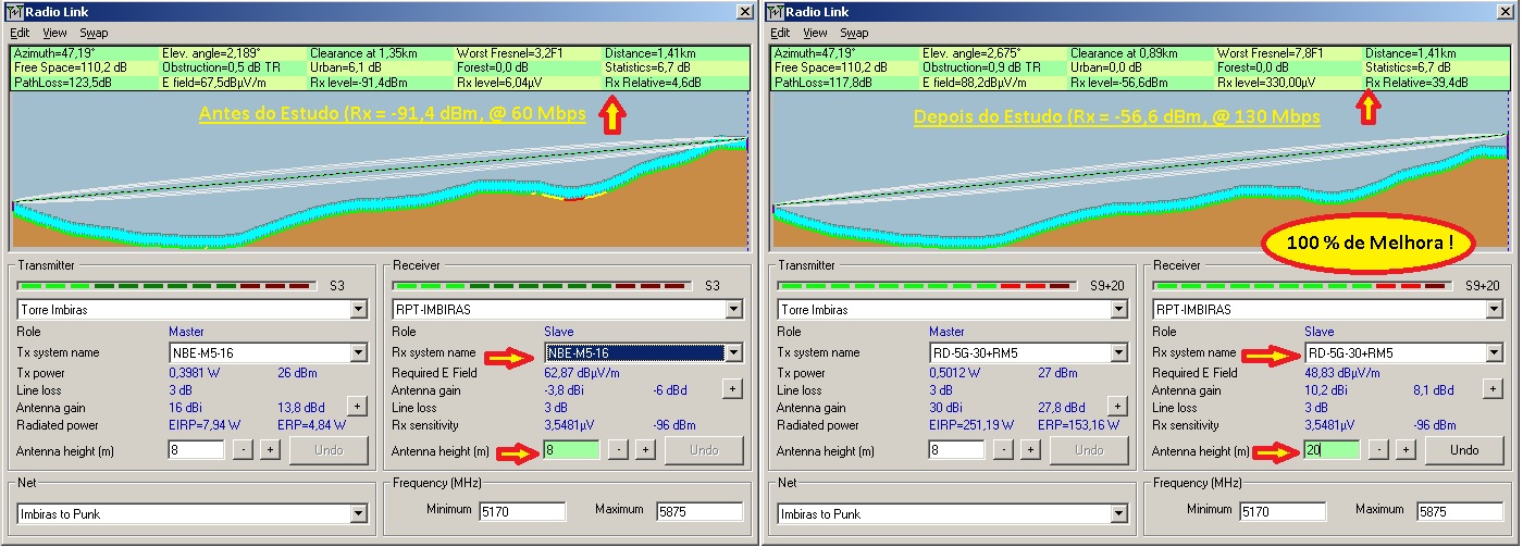Como pode ver na Figura abaixo, fizemos um estudo de desempenho e viabilidade(link budget) desse enlace PTP para esse cliente e identificamos uma série de fatores que estavam degradando o seu desempenho, alguns deles são:
