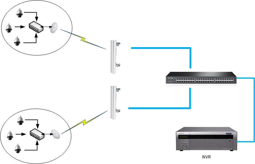 Levando-se em consideração UM GRUPO de câmeras, elas estarão em postes e se comunicarão com um SW genérico Gigabit. Neste mesmo SW entrara o cabo da LAN da Antena Client que fará a transmissão dos dados para os painéis na torre. Os painéis se comunicarão com um SW L2 também Gigabit, e dele vai para o NVR. FIM!