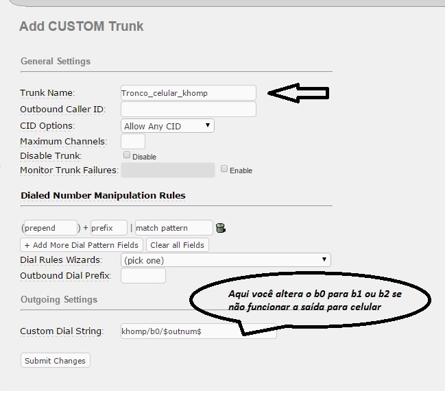 se você vir no print que postei na criação do tronco o campo custom dial string está khomp/b0/$outnum$