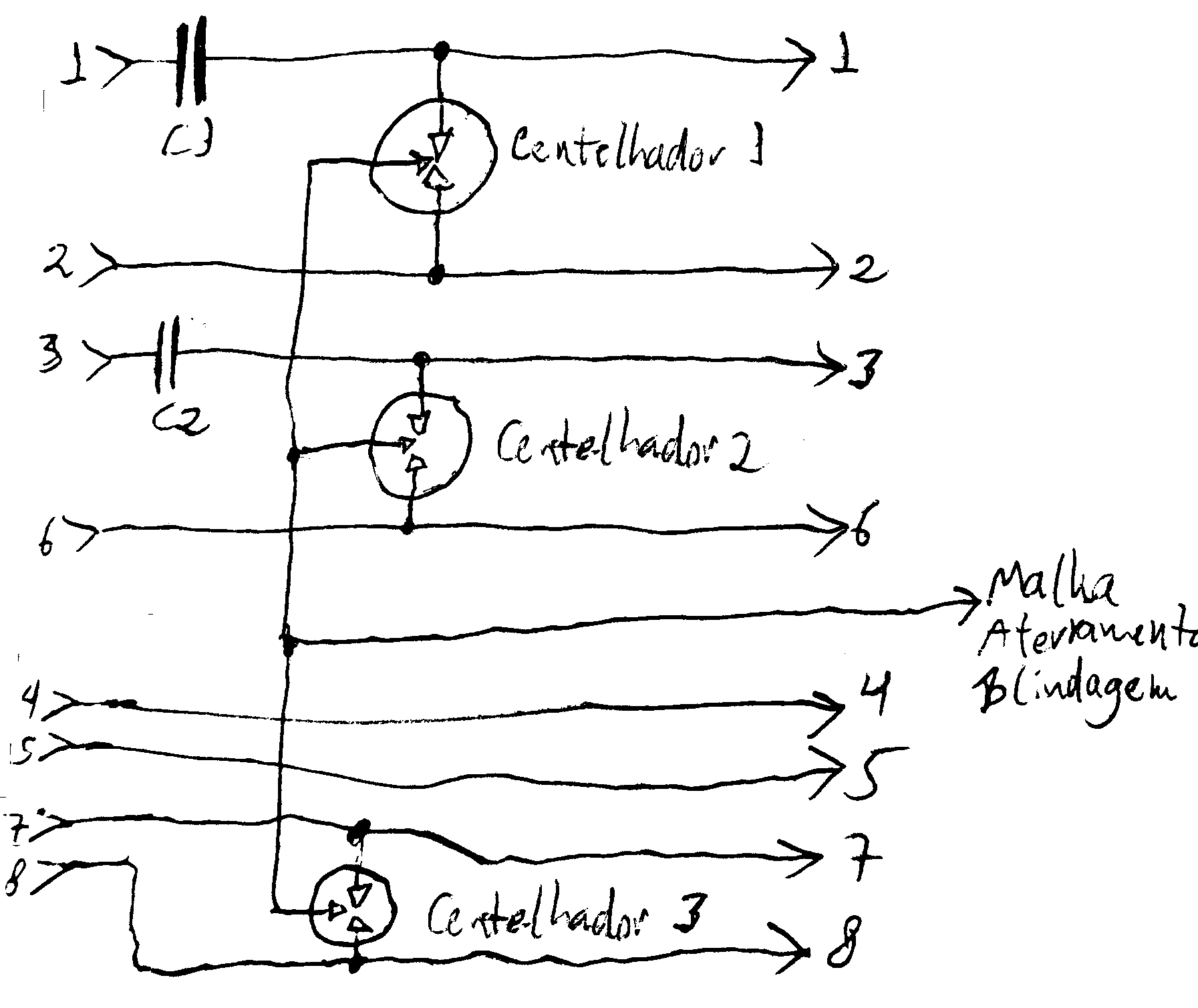 Nota o aterramento. O RJ45 é com aterrament e o pino central de cada centelhador vai pra ele, metade da proteção vem dos centelhadores e a outra metade vem do que eles mandam pra terra, ou seja, precisa aterramento (Pode ser coisa boba tipo 1 haste em solo úmido, não precisa grandes coisas se for pra proteger coisa simples tipo CPE de cliente)