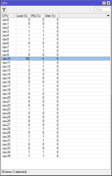 Gente tinha visto muitos relatarem que bgp nestas CCR geralmente um dos nucleos fica quase sempre em 100%, compramos um em uma sociedade, e foi configurado o bgp com duas operadoras nele, uma com 300mb e outra com 200mb, as vezes tenho notado que os pings nao ficam muito bons, e o processamento realmente fica em 100%.