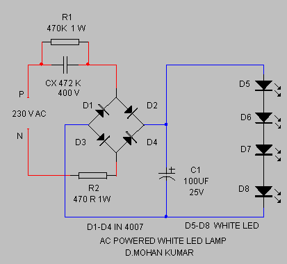 O trabalho pesado de redução de tensão nele fica no capacitor CX. Aí é sugerido um de 4,7nF (472, ou 47 + 2 zeros, dá 4700 pF, e 1000pF = 1nF) mas eu uso valores muito maiores tipo 330nF, mas sem o resistor R1 em paralelo. Quem limite a corrente é o resistor de 470 ohms nesse circuito, esse precisa ser de potencia alta porque ele vai esquentar um pouco. Esse é um circuito pra uns 6 ou 7V, pra ter uns 12V pra ligar uma lampada automotiva (Led + resistor de 150 ohms) eu colocaria um resistor de 420 ohms, é o que estou usando na minha fita de tela de netbook que uso todo dia pra led antes de dormir (Daqui a pouco).
