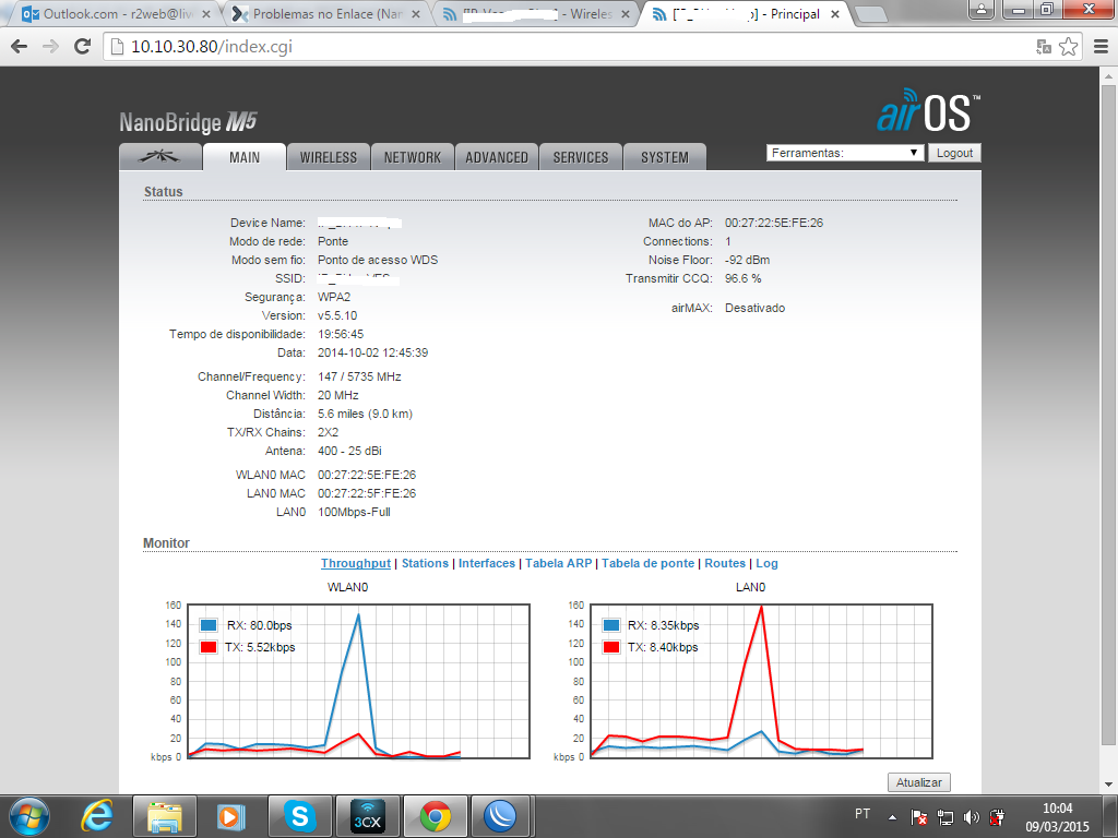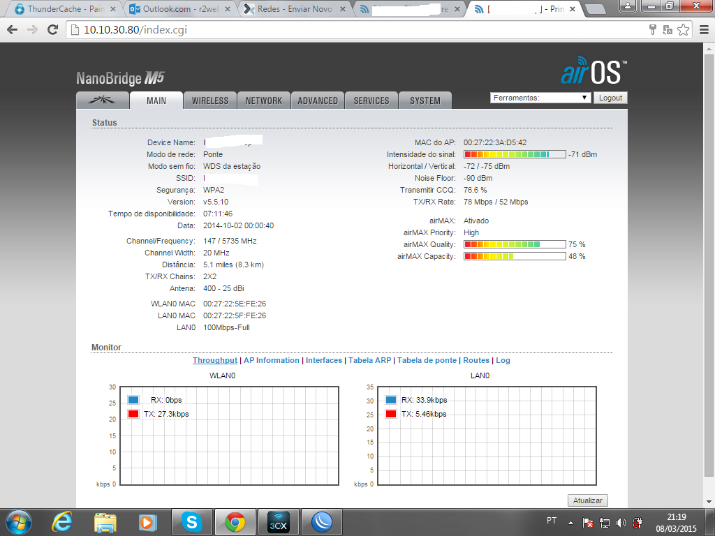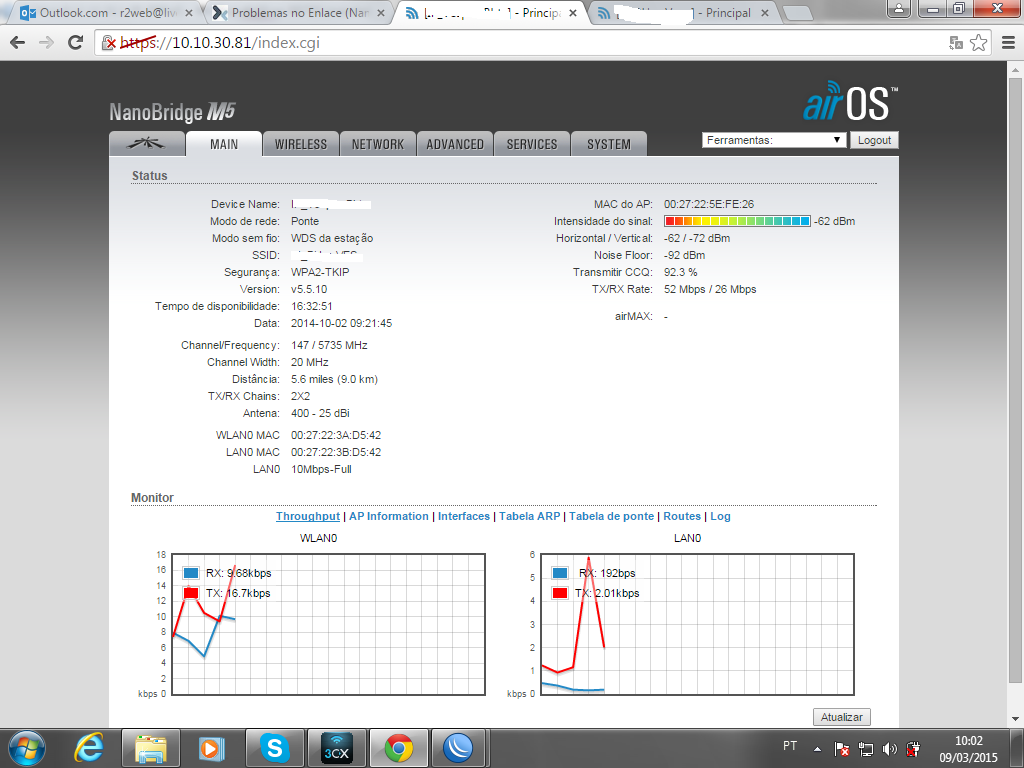 Outra coisa, na antena AP ta com 10Mb a LAN. Pq isso? cabeamento ta certo? Antena pode estar com defeito tambem. Perdendo sinal, energia nao chega certo, qual distancia do cabo de rede?