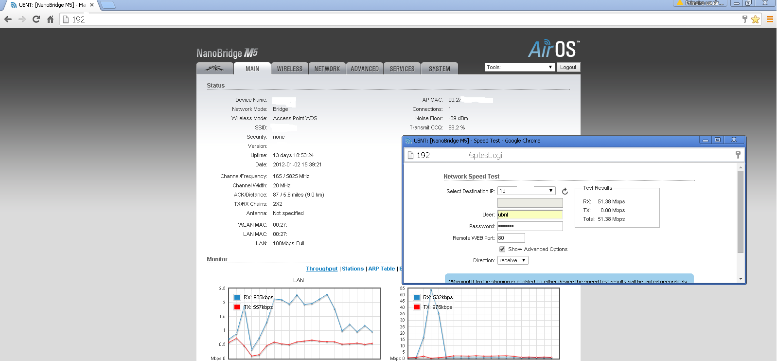 Prezados amigos e colegas do Under Linux !!! venho a traves do fórum solicitar a ajuda de todos senhores e senhoritas :damnmate: , a uma semana atras fechei um ptp com um par de nanobridge25 com distancia de 8.300km Sinal bom ccq relevável , chegamos a 94.4% de ccq ping 1ms de uma ponta para a outra .. porem ''não passa banda '' 0.12M passa só isso e o ccq baixa de 87% para ate 37% ... ja troquei canal , baixei potencia para 1db , ja inverti o Ap pra clientes e virse e versas ,ativei airmax e tesativei , coloquei 40Mghz , 20 e nada .. nesse Pop tenho tbm uma NsM5 que tbm ta dando o mesmo problema quando vai passar banda ccq cai e o station tbm cai ... porem essa nanom5 não faz ptp é somente um painel para um cliente ...segue prints em anexo .Anexo 57771Anexo 57772Anexo 57773 Aguando resposta se alguem dispor em me ajudar ... desde já agradeço a atenção de todos ... Anexo 57774