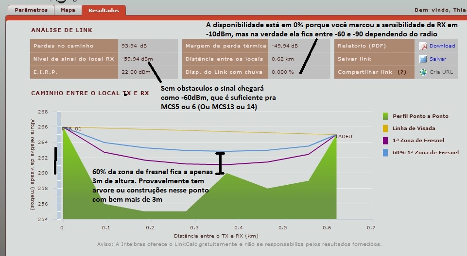 Mas faz o calculo no site pra ver a zona de fresnel, põe no calculo potencia de TX em 24dBm, e sensibilidade de RX em -75dBm, assim terá uma boa noção do que vai ter de sinal em MCS13 com canal de 40MHz.