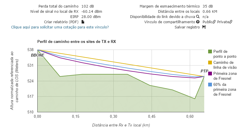 Sobre a visada, os calculos automaticos não tem como ver arvores ou construções, no calculo que você postou, tem logo depois dos 0,3m um ponto em que a zona de fresnel chega a uns 2 ou 3m do chão. E se tivert um poste com rede eletrica alí? Nenhum software consegue identificar isso. E se uma arvore cresceu naquele ponto? Tem arvore como manga que cresce 2m ao ano, se essas imagens de satelite tem mapa de relevo antigo ela nem leva em conta grandes construções, pode ter algo tapando até 60% da zona de fresnel!