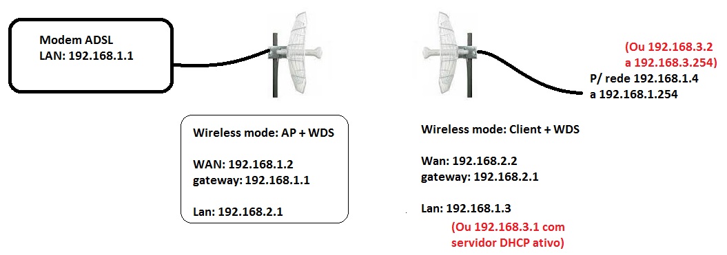 Já o outro equipto, na aba wireless dele deve estar em modo cliente (client + wds), nesse modo a wan é a interface wireless, e a lan é a lan mesmo. Entra por wireless, sai pela lan. Então na wan deste você configura um IP da faixa da lan do AP do ponto-a-ponto (O outro airgrid, o outro nanostation, a outra CPE), e coloca o IP deste AP como gateway. Já na config. da lan você pode usar outra faixa de IP (Uma terceira) ou voltar pra faixa na entrada da wan do outro airgrid/nanostation.