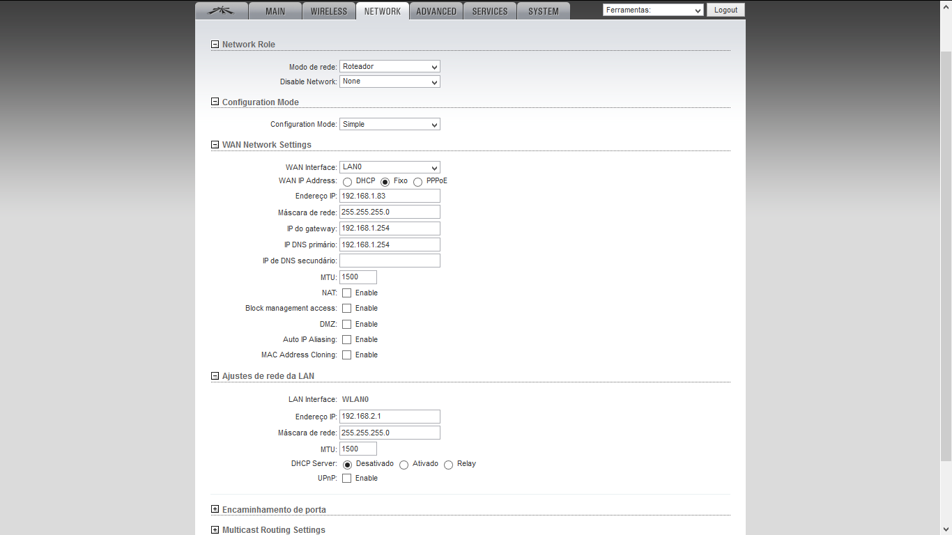Já com a rede em modo roteado você tem uma wan e uma lan, entrada e saída.