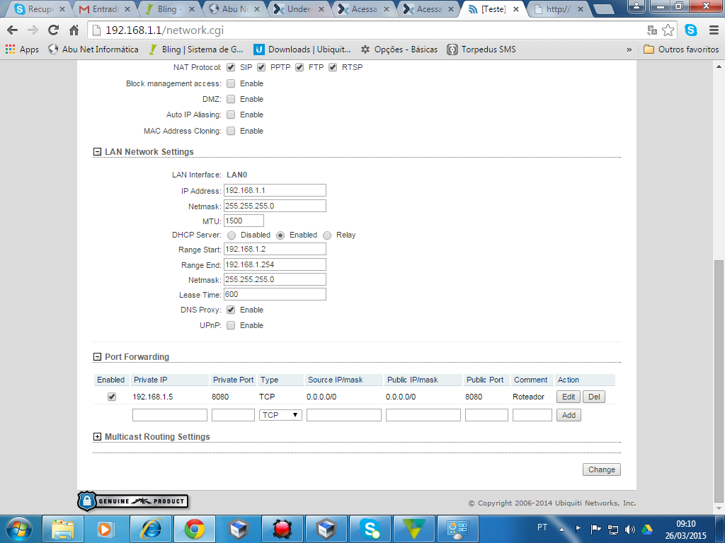 Ja no Roteador TPLink eu fixei o Ip 192.168.1.5, ativei o Acesso da Wan e alterei a porta para 8080.