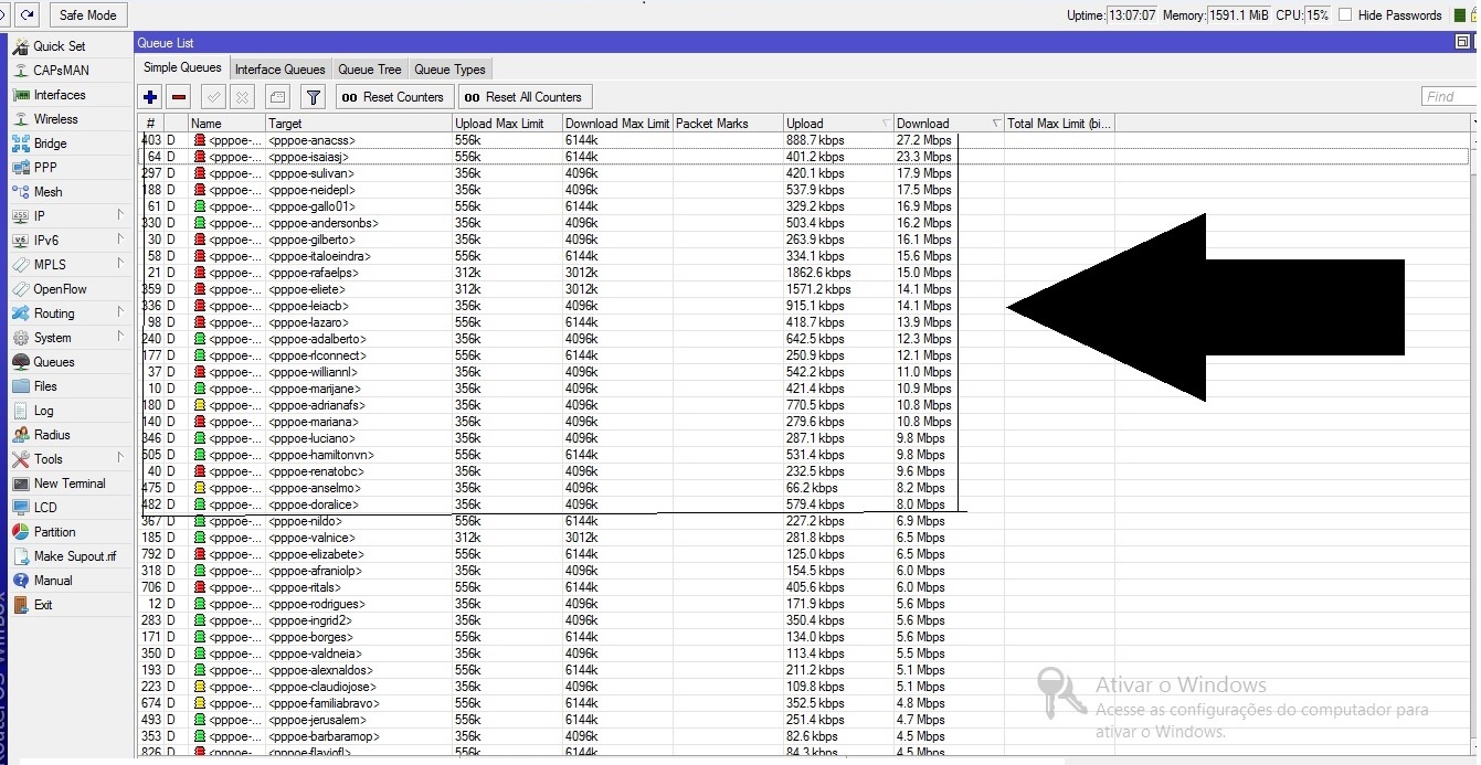 pessoal eu sou leigo no mikotik, hoje olhado mikotik no queues List --> Simples queues na coluna download vi uma coisa q fique louco.vcs pessoal q tem mais experiencia pode mim ajudar com que quer disse é isso ??.
