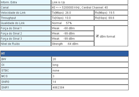 Tem algo estranho nessa info de ruído mesmo. Mostra o sinal em -68dB, e o SNR em 14dB.