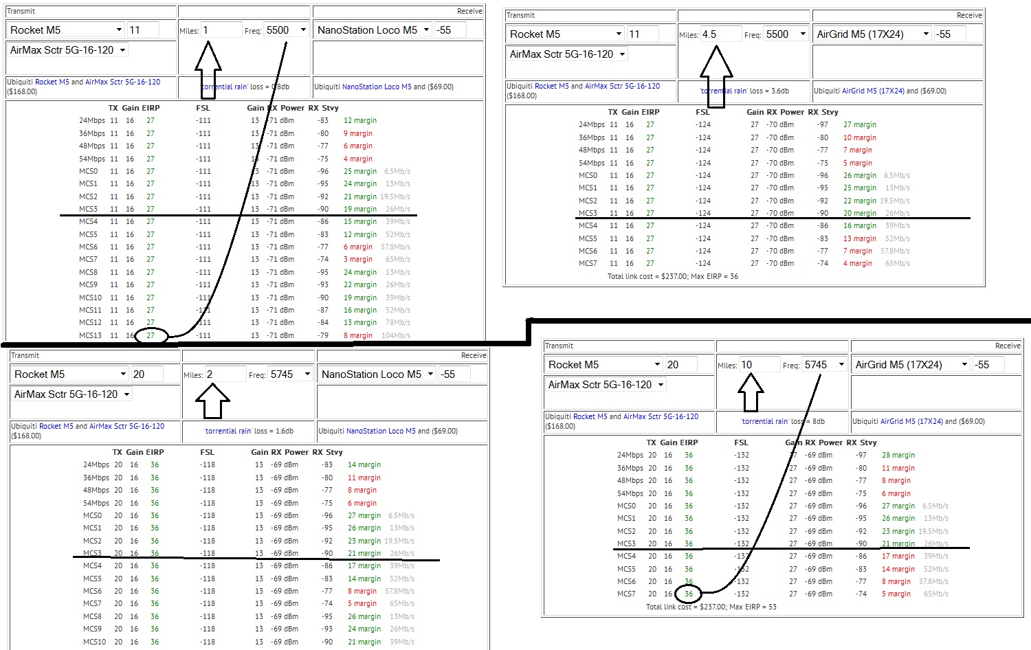 Eu gosto mais do link com calculo ( http://mayo.nuvisions.net/ubnt_link/ ) porque ele mostra a perda pela DISTANCIA.