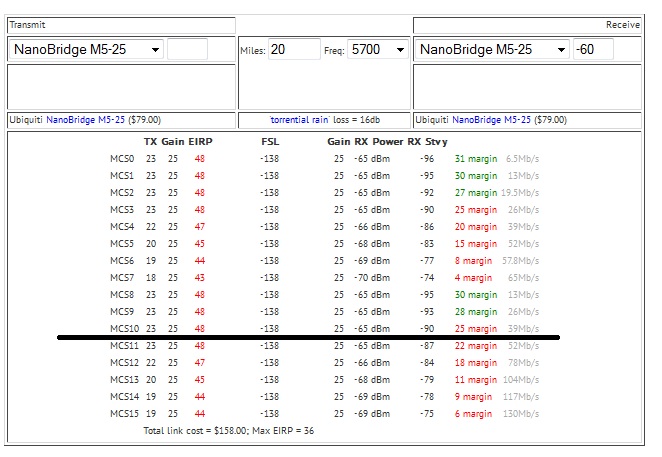 O FSL, Free Space Loss, em 32Km (20 milhas) são 137dBm de perda, ou seja, com Nanobridge 25dBi ele diz que daria só pra MCS10 ou 11, mas se colocar no calculo um rocket, e antena maios tipo essa sua de 33dBi, você vê bem melhor até que datarate poderia subir.