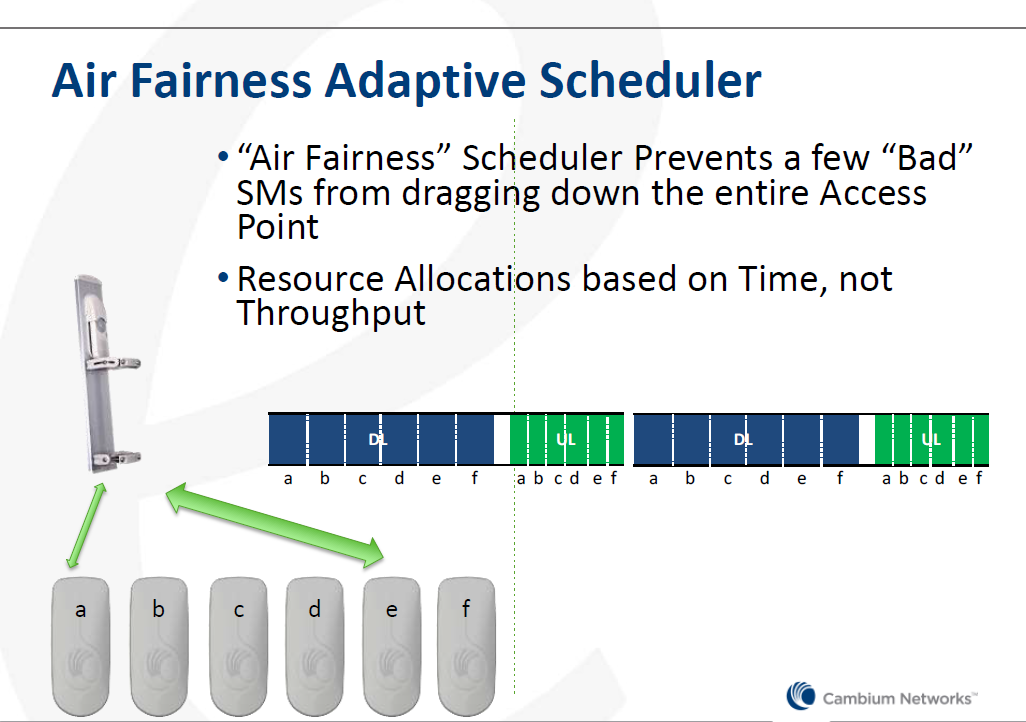 3) Air Fairness – O sistema é Ponto MultiPonto, porém o AP sempre trata os CPE (equipamentos clientes) de maneira individual. Como o sistema é TDD, o ePMP trabalha com 2 divisões: downlink e uplink.  Imagine que cada bloco de DL e UL é subdividido em vários blocos, um para cada SM registrado. Quando o AP fizer a transmissão ou recepção ele vai trabalhar com cada SM individualmente ou seja, é praticamente um ponto a ponto. A vantagem disso é que o AP opera com a modulação máxima de cada cliente. Logo, não importa se você tem um cliente mais distante, ou com muita interferência, com baixa modulação. Isso não vai afetar toda a sua rede, pois o AP trabalha com os SMs de maneira individual.
