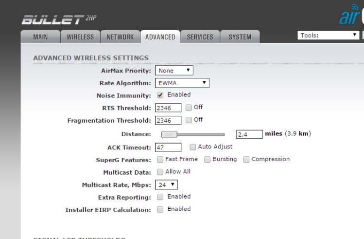 Eu nunca fui fã de Bullet2, chamo ele de lixo pra baixo, o Bullet 2HP melhora um pouco mas ainda não me agrada, o Bullet M2 deVIA ser bom mas na prática nunca consegui nada ótimo. O que me dá ótimas conexões com essas antenas de grade são RB411 e cia, mesmo as limitadas a 20dBm de potencia, com somente B/G.