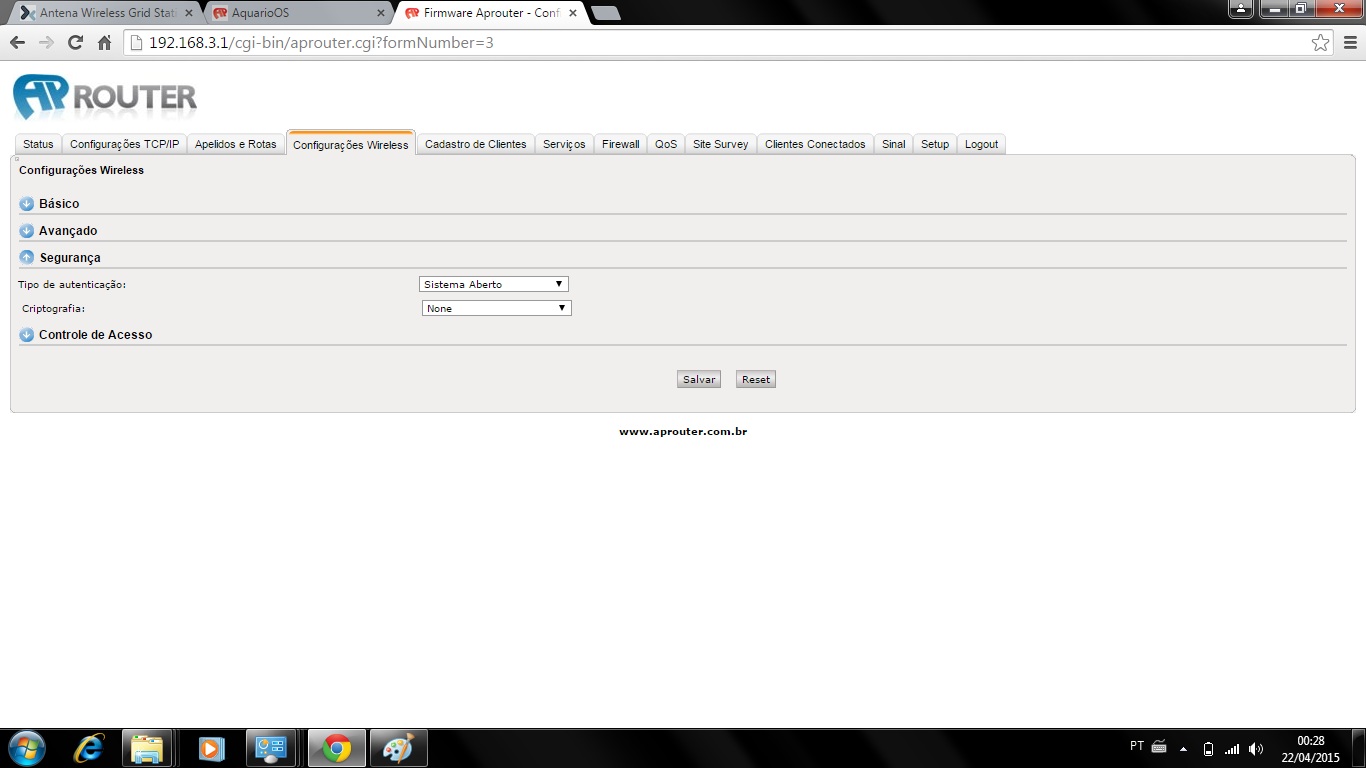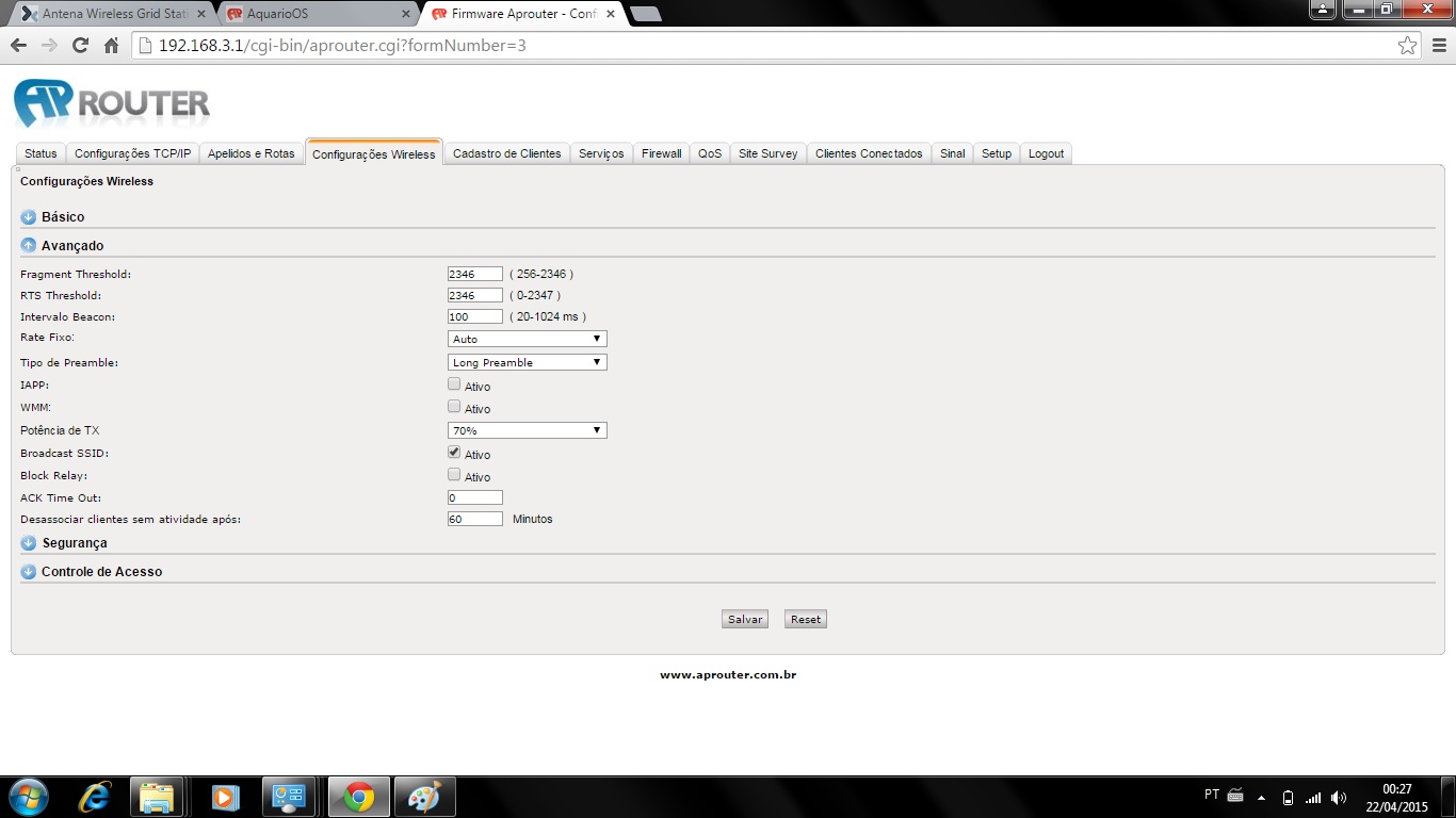(Ah, teste colocar o ack-time fixo caso tenha problema de performance, digamos em 90uS no APRouter. No modo automatico ele varia muito e as vezes não permite trafego muito bom tipo mais de 2Mbps, enquanto fixo dá pra chegar a 4Mbps fácil)