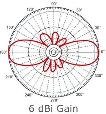O datasheet dos Unifi é muito pobre, não informa a potencia e sensibilidade conforme o datarate (Mas pode se basear em Rocket M2 e cia, são sempre valores similares, variação de 1 ou 2dB não muda o mundo), e também não informa o diagrama de irradiação da antena, mas sendo uma colinear comum de 6dBi o diagrama deve ser mais ou menos isso: