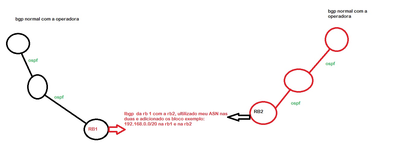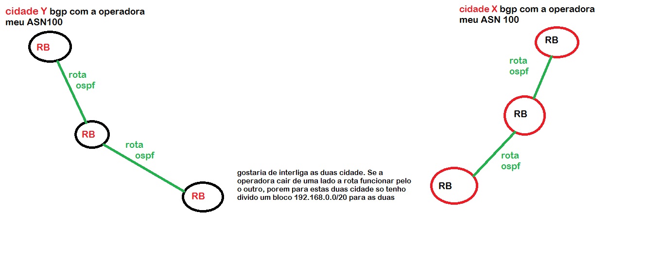 estou precisado de uma sugestão no que eu posso melhora em minha rede, entrei recentemente em uma empresa, e ela é instalada em 2 cidade, onde pegamos link com a mesma operadora, todo nosso sistema é com mikrotik, e as configuraçoes de enlace são as bem simples, ospf e bgp. O meu objetivo inicialmente seria fazer desta forma que esta no desenho, porem existe um problema. E que so temos um bloco de ip exemplo 192.168.0.0/20 e este bloco e dividido de forma errada para as 2 empresa, ou seja, para funcionar da forma que eu queria teria que ser divido em /21 para cada cidade, e daria certo. Mas a empresa quebrou o bloco tudo em /24 e por cima de tudo ela nao esta usando estes blocos /24 de forma organizada, ela saiu pegando tudo fora de sequencia o bloco e misturando as ordens. Alguém pode me dar uma ideia?