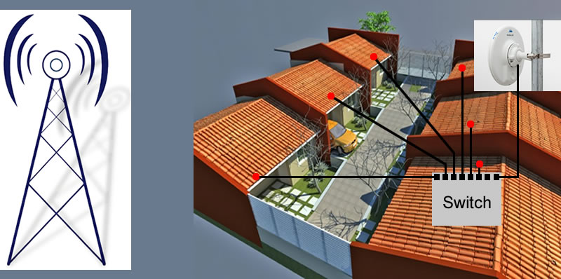 Instalar um mastro galvanizado de 3 metros de altura com 1 polegada de diâmetro encima de uma caixa d'agua e nele colocar uma nanobean 22dbi M5 Nbe-300 5.8ghz ( http://produto.mercadolivre.com.br/M...-300-58ghz-_JM ) fazendo a recepção de um link de 6 megas ( será 1 mega para cada residência ) a 2 km de distância da torre com visada limpa e distribuir via cabo a partir daí.