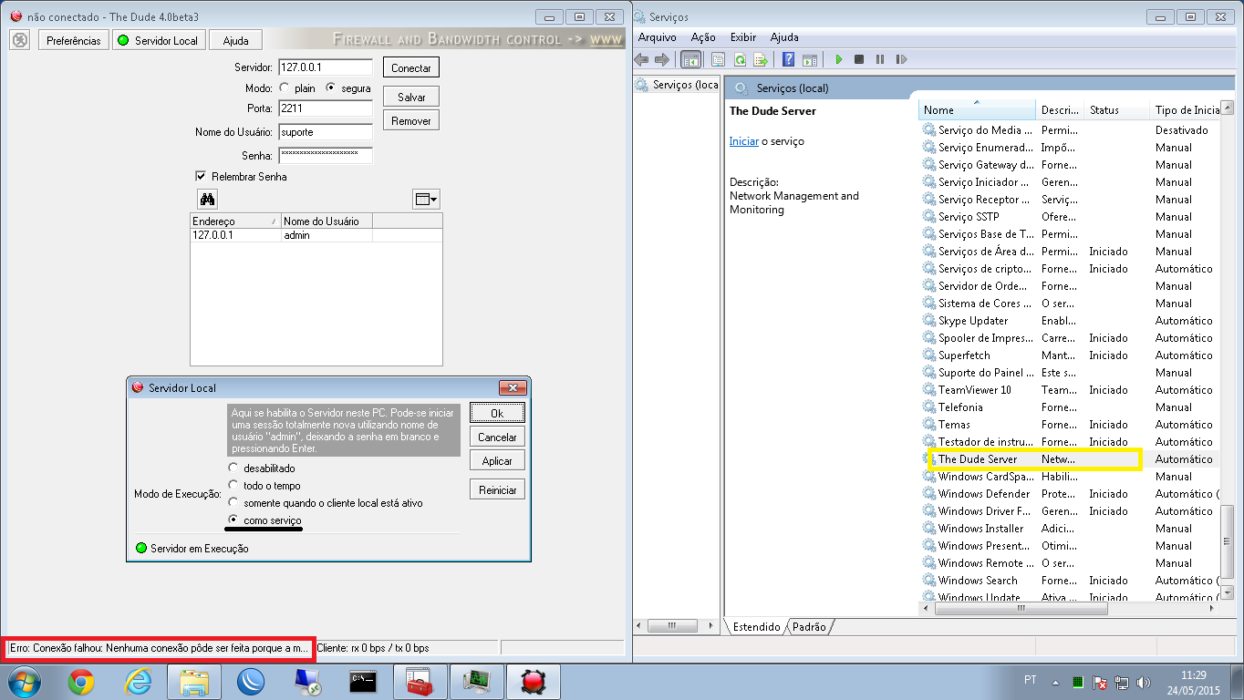 Já tentei de tudo... desinstalar, excluir todas as pastas, apagar o cache do Windows, executar como modo de compatibilidade, executar como administrador, reiniciar o "The Dude Server" nos serviços do Windows e instalar novamente; porém sem sucesso.