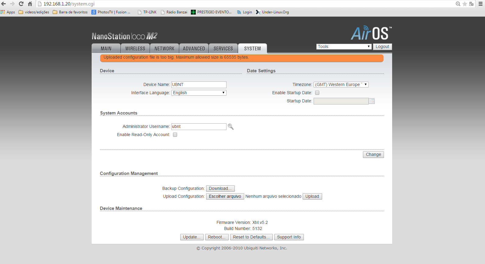 Pode ser cache do browser. E pelo visto você marcou pro Chrome traduzir a página, aí o conteúdo exibido não tem nada a ver com o conteúdo gerado pelo servidor http do AirOS, evite tradutores porque ele zoneia tudo (Fora que traduzem tudo errado, termo técnico sai tudo errado, é só desgraça).