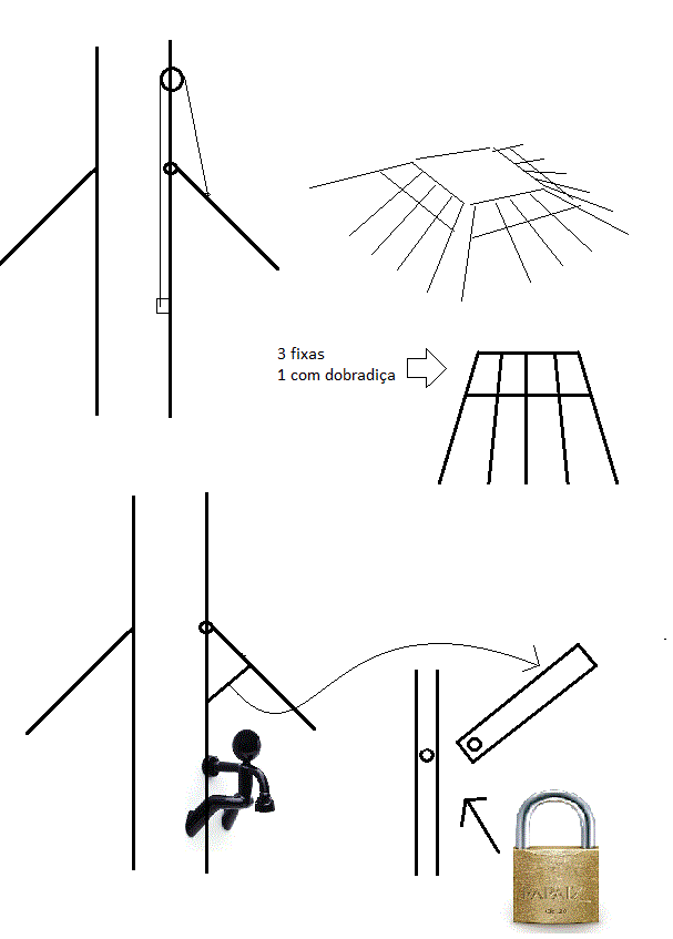 Rubem. Excelente teu projeto, o problema é o cadeado, mas podemos bolar algo que se ele conseguir puxar o cadeado, tudo venha a desabar sobre ele, tipo eu coloco um dente de fixação neste guarda chuva, quando a trava é solta a lingueta volta e o guarda chuva desce com tudo o cara vai ficar dentro do guarda chuva ai ele desce o guarda chuva desce com ele, vai ser hilariante, ou ele se joga para baixo ou vai descer com o peso do guarda chuva. Já para o dono da torre não acontecer isto e sabe deste detalhe a dica que vou dar não coloco aqui não, isto só para quem comprar este projeto de mim ou de voce, te passo a dica de como manter o guarda chuva e tu não se passar por ladrão. kkkkkkk