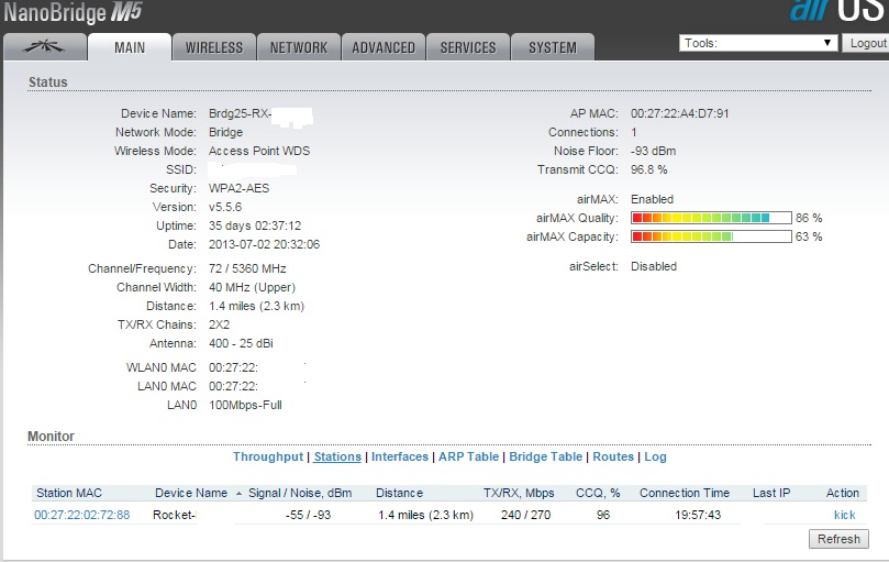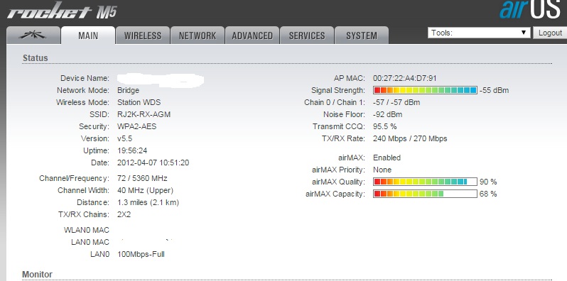 Boa noite, tenho um enlace com aproximadamente 2Km, os testes de banda da ubiquiti mostram resultados bons, porém na realidade fica outra coisa, vou postar para vocês algumas imagens de como está o enlace. Estou utilizando uma Rocket M5 com dish de 30dBi para TX, e para RX uma bridge de 25dBi, se eu trocasse essa bridge melhoraria? Agradeço as dicas e seguem as imagens. P.S.: Em um enlace de 2Km com 2 Rocket M5 e 2 Dish de 30dBi, deveria está passando quantos Mbps na real? Grato!