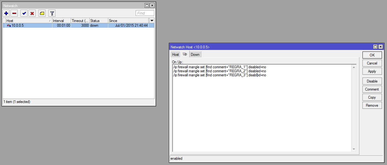 /tool netwatch add timeout=3s host=10.0.0.5\ up-script="\ /ip firewall mangle set [find comment=\"REGRA_1\"] disabled=no\r\n\ /ip firewall mangle set [find comment=\"REGRA_2\"] disabled=no\r\n\ /ip firewall mangle set [find comment=\"REGRA_3\"] disabled=no"\ down-script="\ /ip firewall mangle set [find comment=\"REGRA_1\"] disabled=yes\r\n\ /ip firewall mangle set [find comment=\"REGRA_2\"] disabled=yes\r\n\ /ip firewall mangle set [find comment=\"REGRA_3\"] disabled=yes"