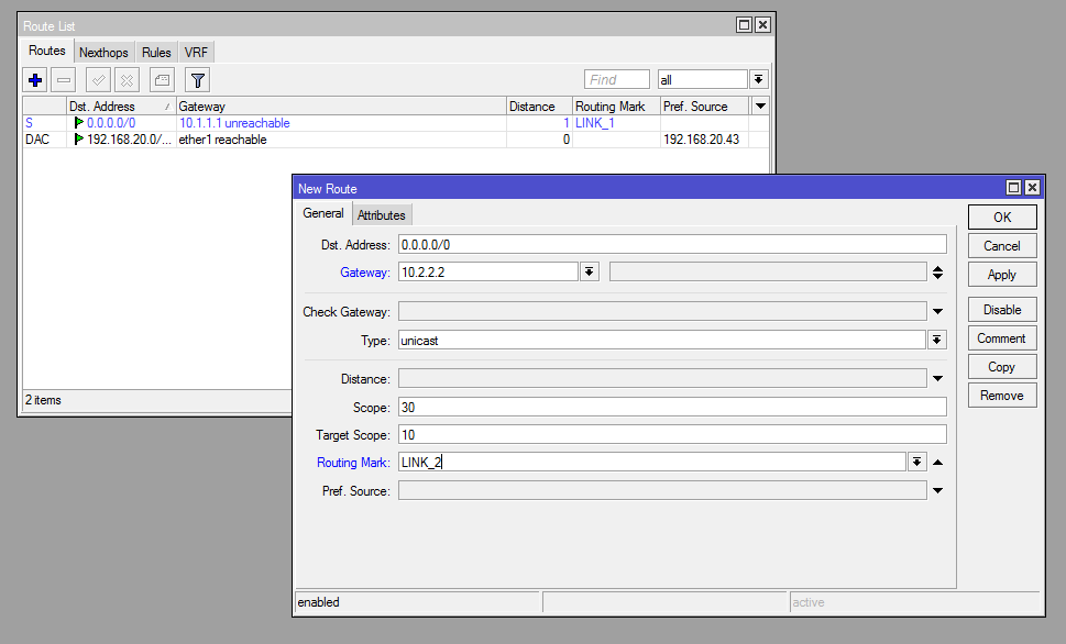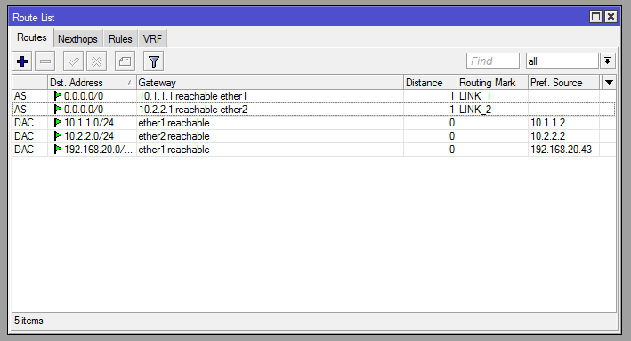 no ip routes e crio... mas soh funciona se coloco dst address como 0.0.0.0/0