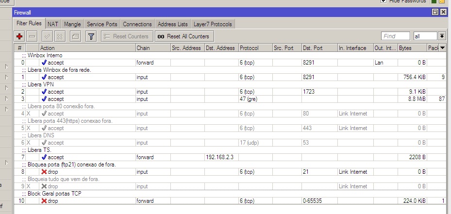 Essas regras liberando acesso da lan para internet e lan MK(INPUT), seria para n perder acesso ao MK? como seria essa regra?