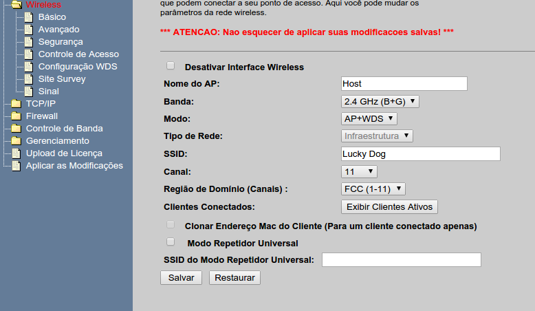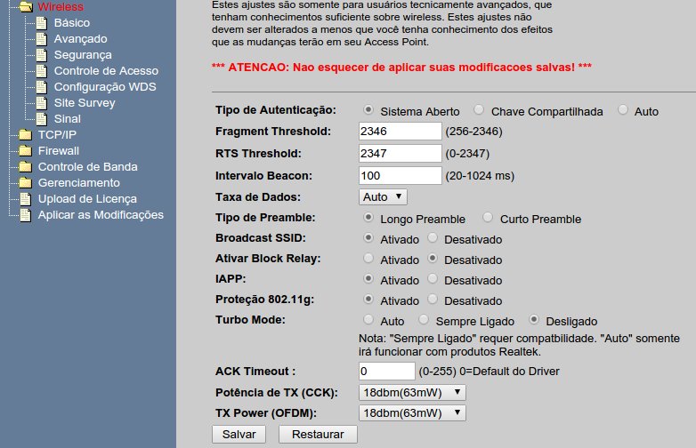 Pô meu. Eu sempre apliquei as configs depois de gravar cada tela. Saberia dizer pq não pode aplicar no final? Isso estamos falando do AP Router 7.3 né? Vou testar isso hoje e te falo. Mas pode ser que ajude, ou resolva, pois o sinal dele tá mais fraco que routers domésticos com aquelas anteninhas integradas de 2bdi.