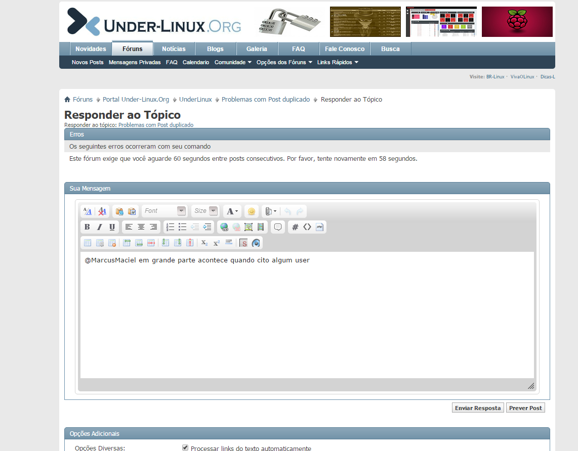 Fui informado pelo @JonasMT, sobre um erro de mensagem duplicada que pede para que aguarde 60 segundos, porém o post é enviado de toda forma. Gostaria de confirmar se este erro também está afetando os senhores.