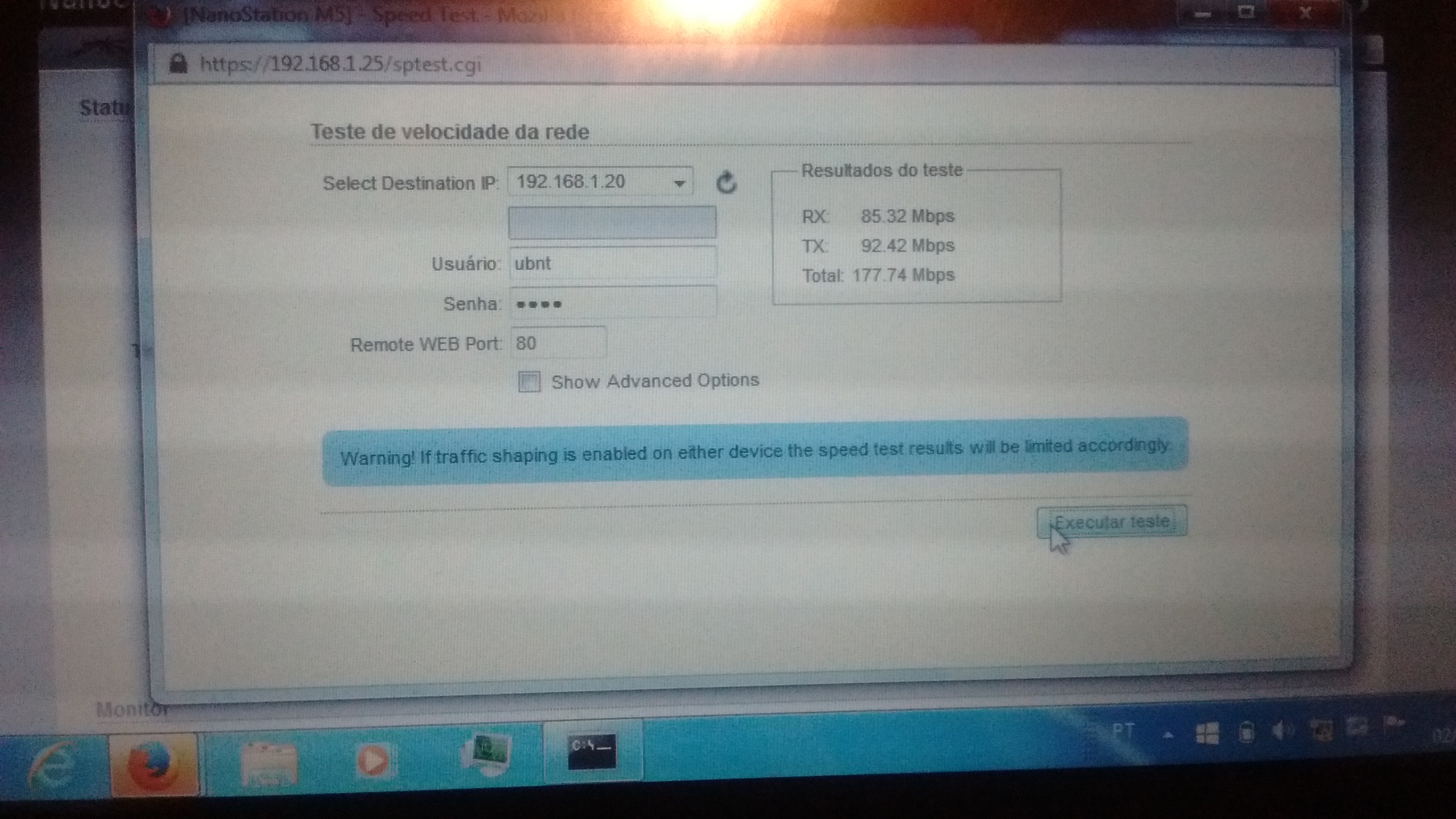 boa noite ? pessoal sou leigo em redes, estou montando um provedor de internet, comprei 2 antenas nano m5, uma como ap e outra como cliente, acho que alguma coisa esta errada nas configurações, pois minha taxa de velocidade informada pelo airos esta 177.74, RX:85.32 TX:92.42,O nose floor fica em no minimo -89, o CCQ fica em torno de 91.6 porcento, minha internet é GVT de 15 megas,ja desbloquiei o modem um sagemcom,configurei ele como bridge e nao aparece interne tno modem,so aparece quando coloco o modem em modo roteador, plugo ele na porta lan 1,2,3,4 e nada de rede na cliente,detalhe tem uma configuraçao no modem para as lans com IP´S e nao sei como,vou mandar foto da configuraçao da antena cliente e peço humildemente ajuda aos caros colegas de trabalho.Anexo 60796Anexo 60797Anexo 60798Anexo 60799