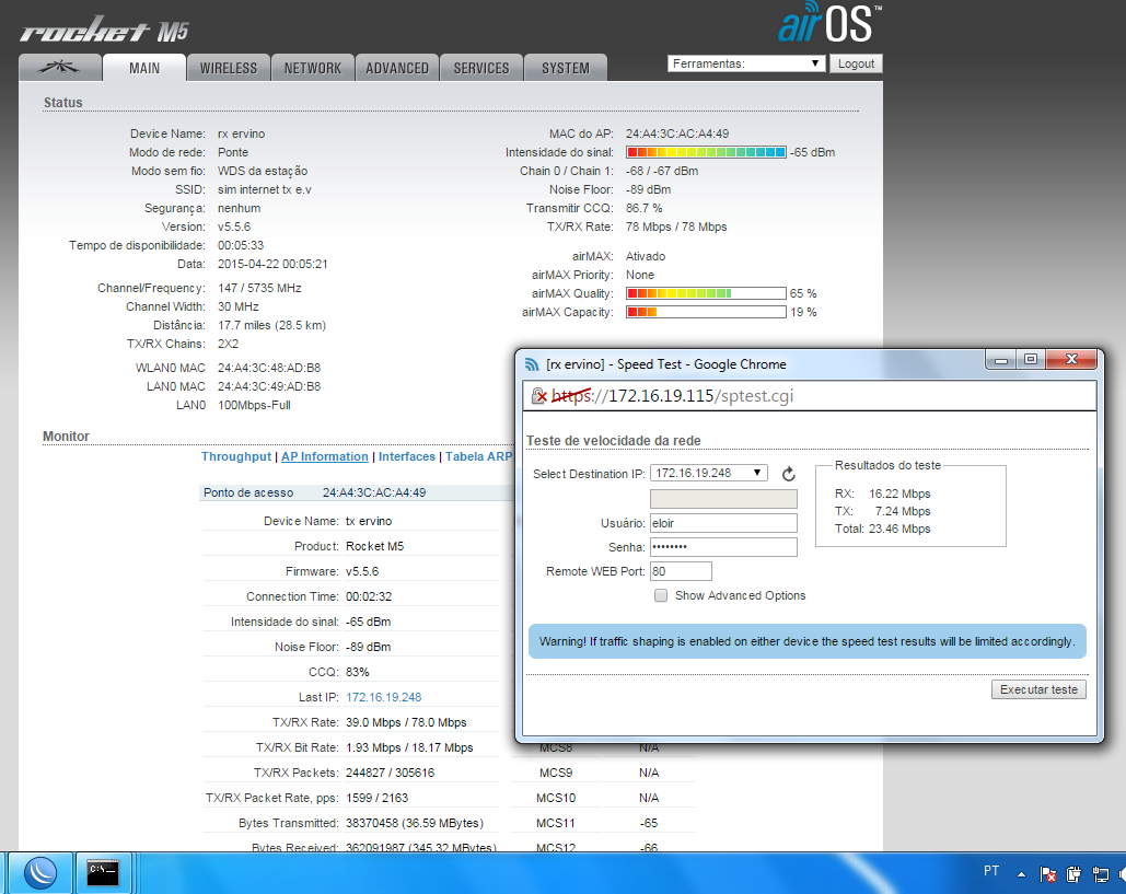 ola amigos boa tarde...ptp rocket dish30!ja testei todo tipo de canal,esta gargalando em 18mb/s...quando passa 18mb,um pacote de 10000 bytes esta demorando 1050ms pra passar...aceitavel seria uns 50ms!!!tenho um enlace de 29.6km tmb com rocket dish 30 que to conseguindo passar quase 60mb de rx...alguem tem alguma ideia???to com 130 clientes nessa rota!ta começando a complicar minha vida!