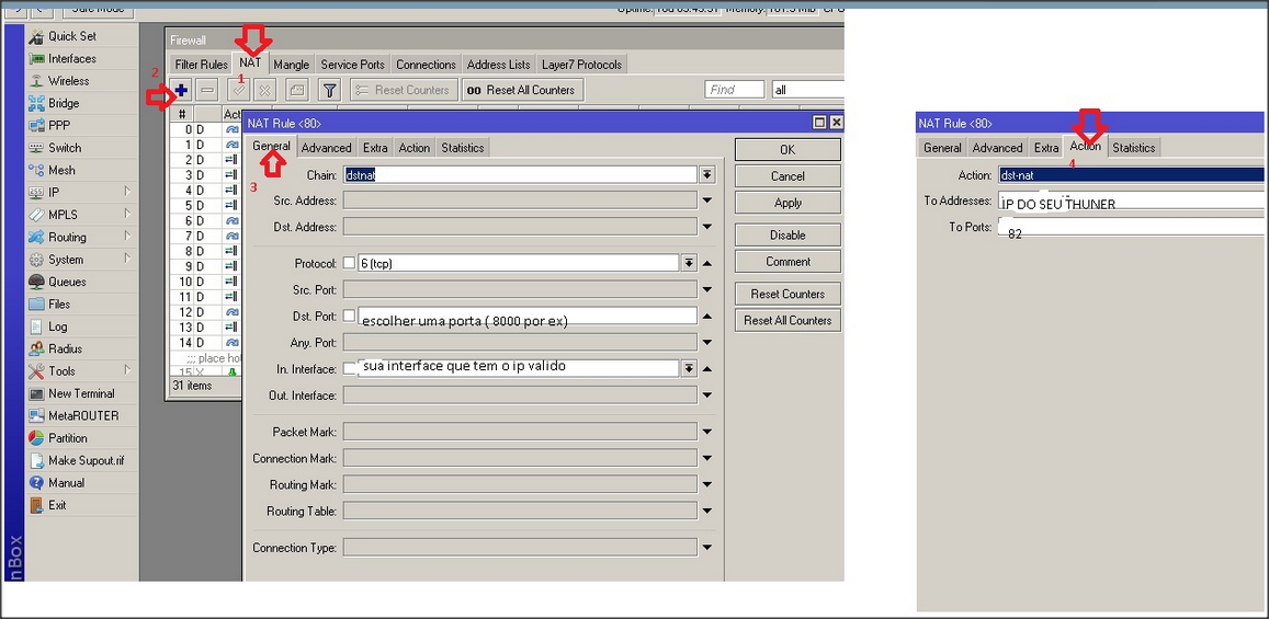 Primeiro a RB450G que recebe o link da fibra eu redirecionei  a porta 8181 para IP 192.168.99.2  este IP é da RB750GL  (clientes).
